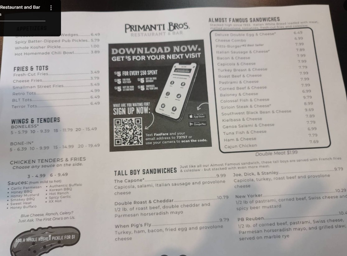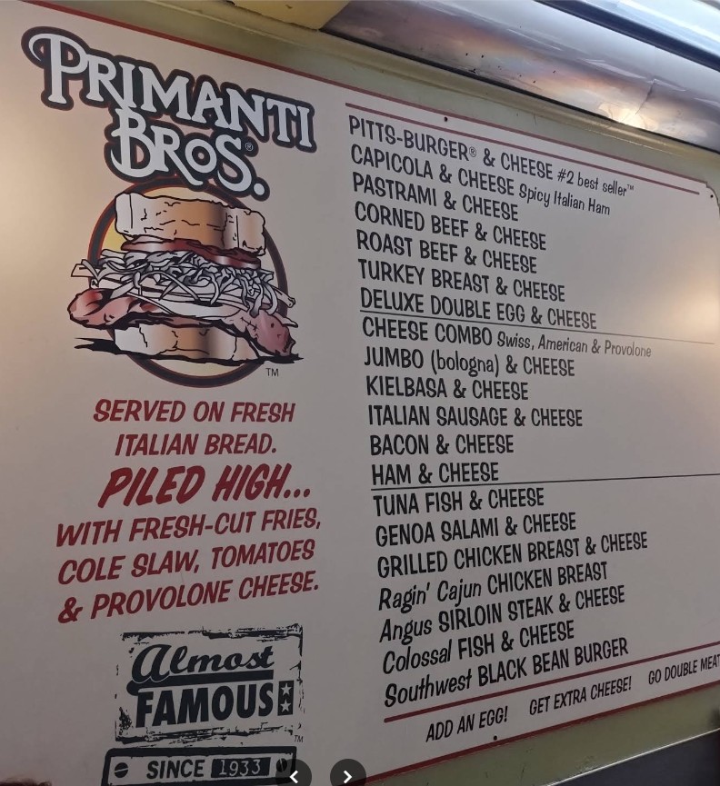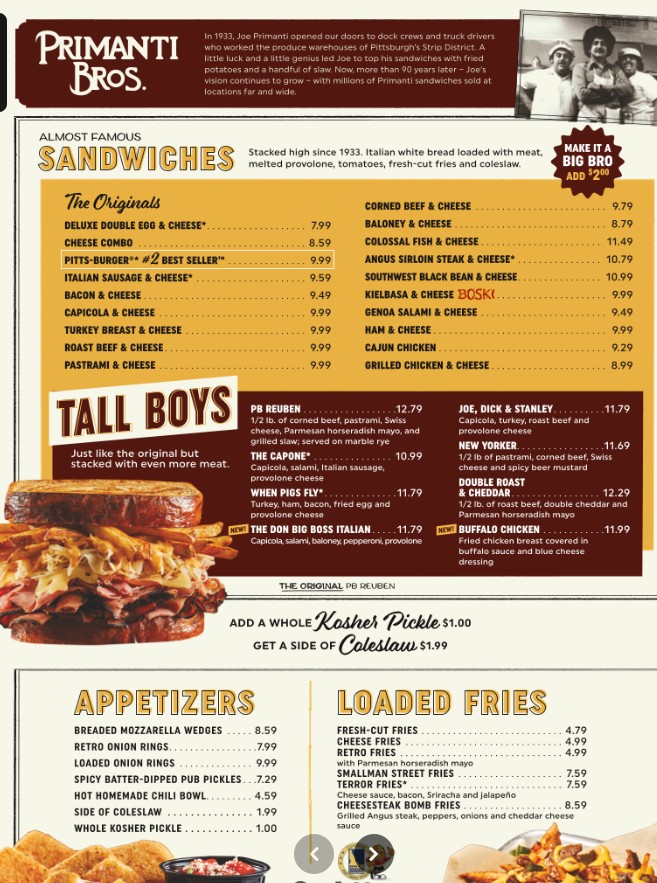 At Primanti Bros. Restaurant and Bar, we’re known for our iconic sandwiches piled high with delicious ingredients, fries, and coleslaw all packed between two slices of bread. Located in Pittsburgh, PA, our restaurant menu also features tasty wings, chicken tenders, and refreshing drinks in a vibrant, casual atmosphere. Whether you're here for a quick bite or enjoying a night out with friends, our menu offers something for everyone. Come join us and experience why Primanti Bros. has become a Pittsburgh favorite!